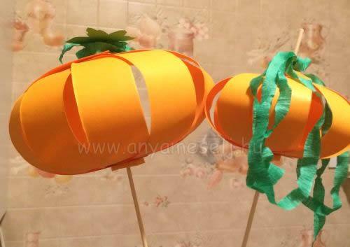Fűzzétek fel hurkapálcára, formáljátok meg a papírcsíkokból a tök formát.