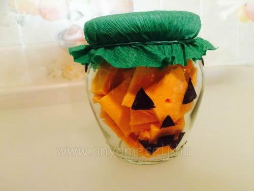 majd ezzel töltsék meg a befőttesüveget. A tetejére krepp papírt fogatunk gumival, megrajzoljuk az arcát