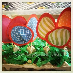 4. Fogj egy piros tojásmintát és egy olyat amin minta is van és ragaszd össze úgy, hogy közé ragasztasz egy hurkapálcikát vagy spatulát.