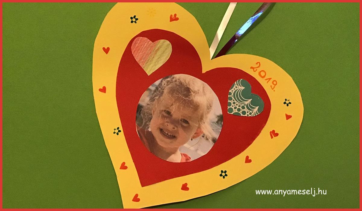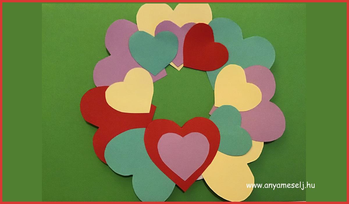 Egy nagyobb, és egy kisebb színes papírszívet vágjunk ki, majd ragasszuk egymásra.