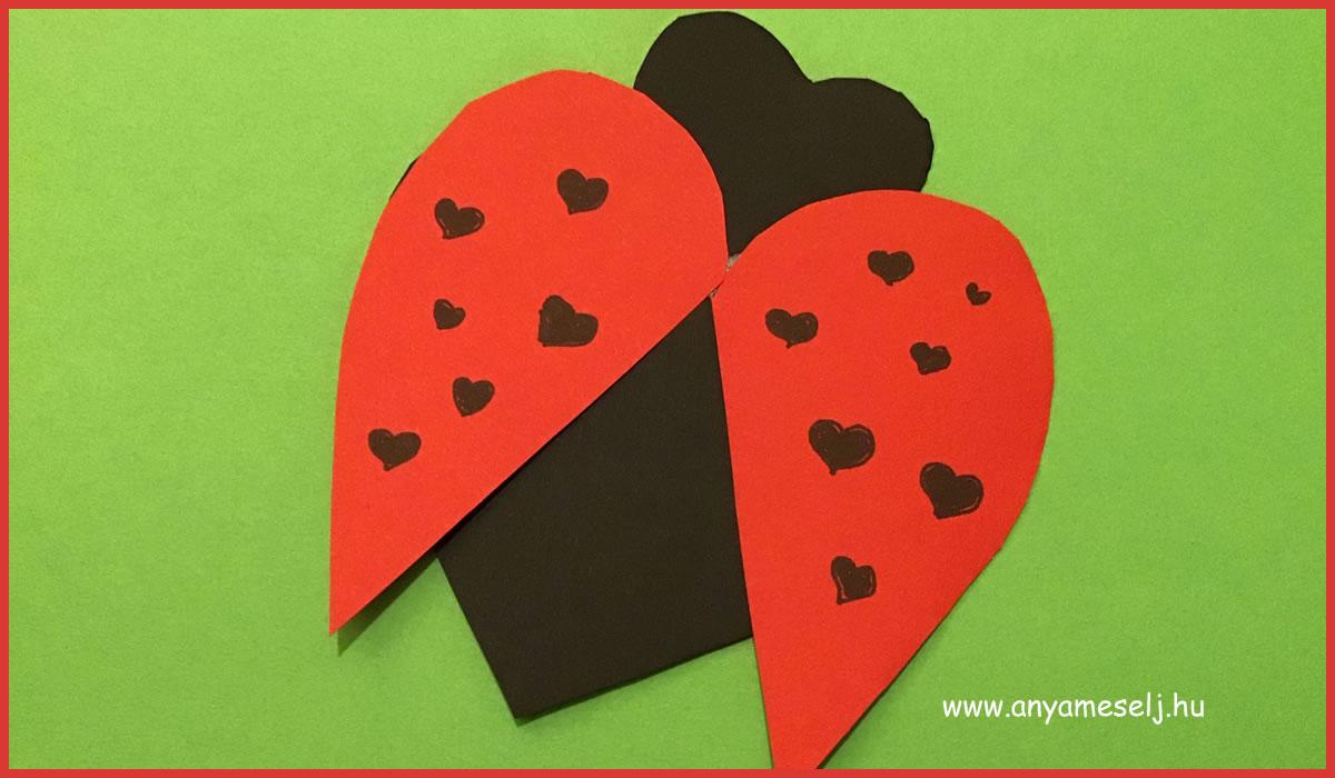 A nagy fekete szív lesz a katica teste, erre ragaszd fel a kisebb fekete szívet, ami feje lesz.