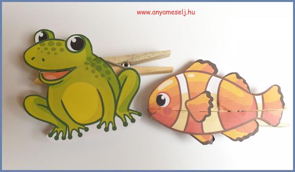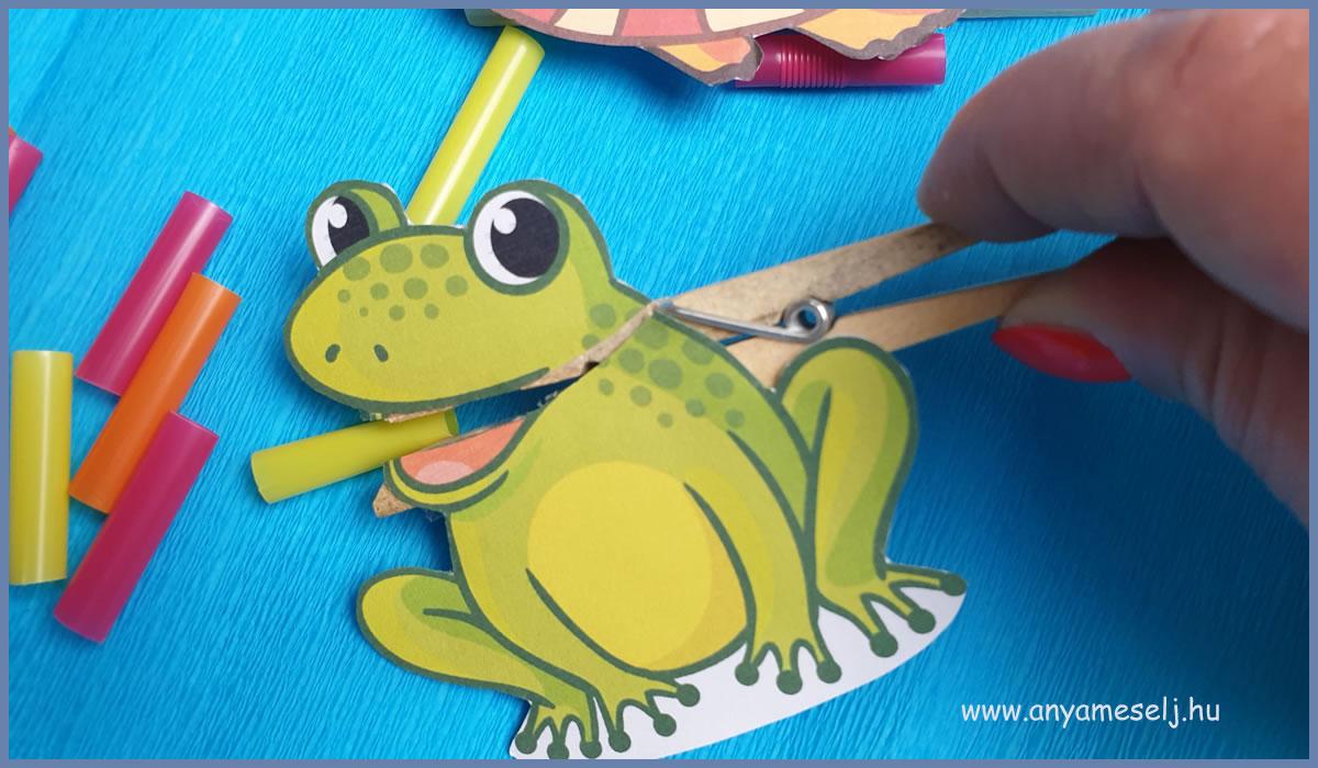 - A békát a szája magasságában, a halacskát a szája fölött picivel vágd félbe, és ragaszd fel a facsipeszre.